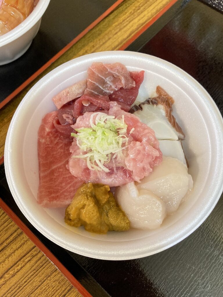 市場内の店舗でお刺身の切り身やお惣菜などを選んで